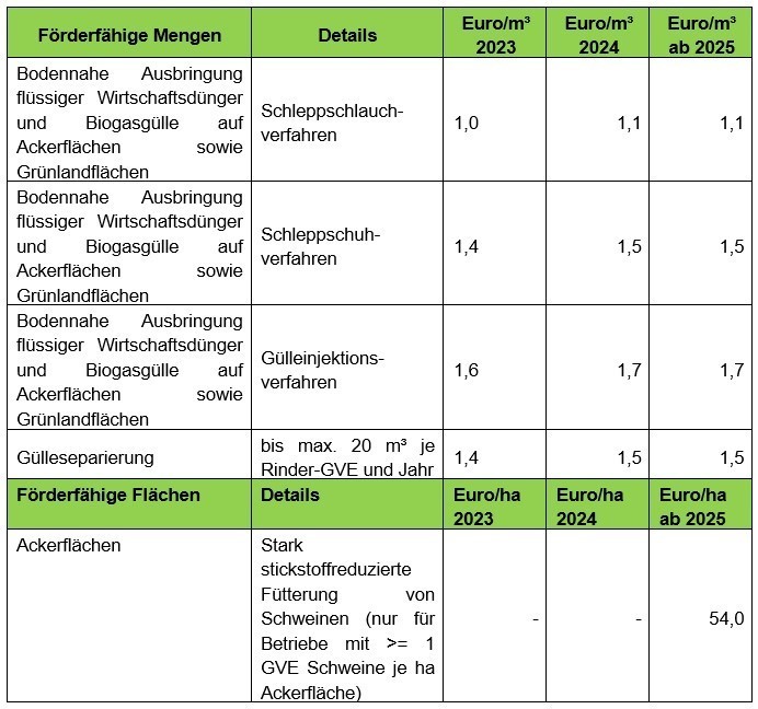 Die Unterstützung wird für die bodennahe Ausbringung flüssiger Wirtschaftsdünger und Biogasgülle auf Acker- und Grünlandflächen, sowie für die Gülleseparierung von Rindergülle sowie ab dem Antragsjahr 2025 für die stark stickstoffreduzierte Fütterung von Schweinen gewährt. Gefördert werden Kosten, die durch den Einsatz von bodennahen Gülleausbringungsgeräten für die Ausbringung von Wirtschaftsdünger und Biogasgülle auf Acker- und Grünlandflächen als auch durch die Gülleseparation und ab dem Antragsjahr 2025 durch die stark stickstoffreduzierte Fütterung anfallen.