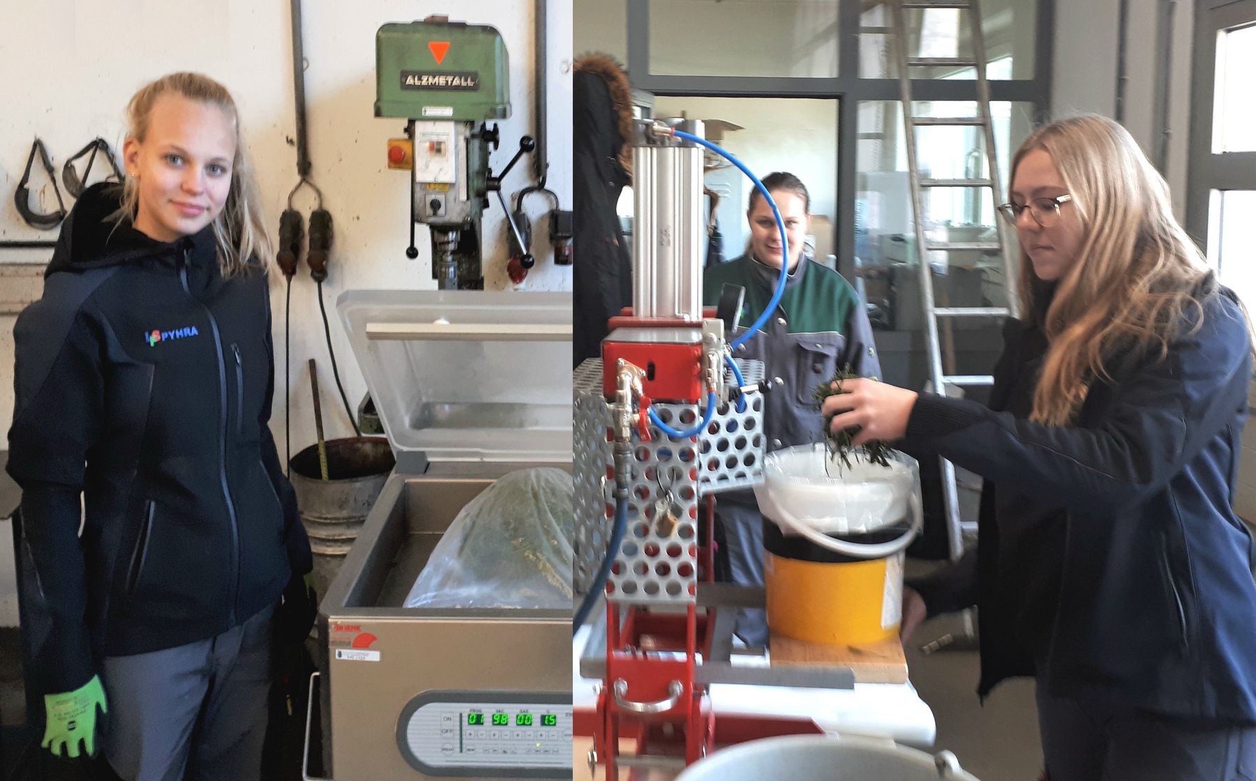 Mit Hilfe einer speziellen Presse (rechts im Bild) wird das Futter in den Behältern verdichtet und anschließend luftdicht verschweißt (links). Nach 6 Wochen Gärzeit wollen wir davon jeweils Silageproben zur Analyse des Futterwertes entnehmen. © LFS
