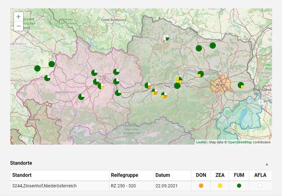 An Standorten im Mostviertel wurde bereits eine geringe bis mittlere Belastung mit Mykotoxinen festgestellt. Vor allem das Mykotoxin DON (Deoxynivalenol) musste "hellorange" dargestellt werden (also mittlerer Befall).