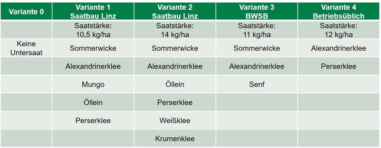 Beim Versuch wurden fünf Varianten angelegt. Die Basis der Mischungen stellen vor allem Leguminosen. Um den Anforderungen an die neue ÖPUL Begrünungsvariante 7 gerecht zu werden, wurden in allen Mischungen - bis auf der betriebsüblichen - mindestens drei verschiedenen Arten aus zwei Pflanzenfamilien eingesetzt.