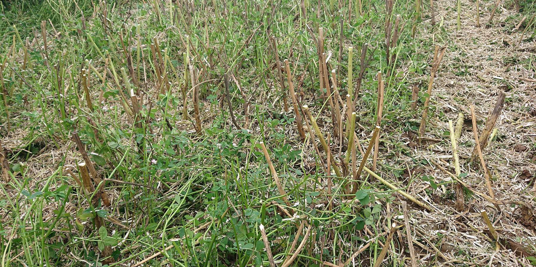 Sommerwicke und Alexandrinerklee sind über dem Winter nicht vollkommen abgefroren. Das spielt beim Klee keine Rolle. Im Gegenteil: der Klee wächst unter dem Raps weiter und liefert noch etwas Stickstoff durch die Knöllchenbakterien. Durch die Blüte finden vor allem Bienen und auch andere Insekten eine Nahrungsquelle. Die Wicke kann zu Problemen führen, wenn diese nicht abfriert, da sie auf den Raps hinaufrankt.