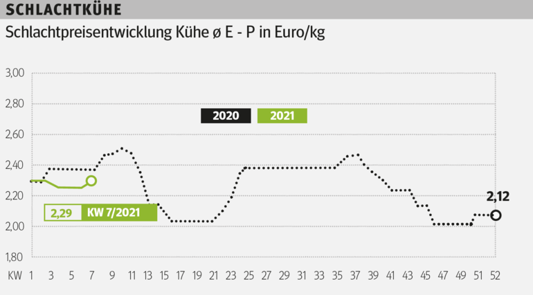 - Schlachtkühe: Ein geringes Angebot trifft auf eine verhaltene Nachfrage. Der Bio-Zuschlag ist leicht gestiegen. Der Preis ist stabil.
