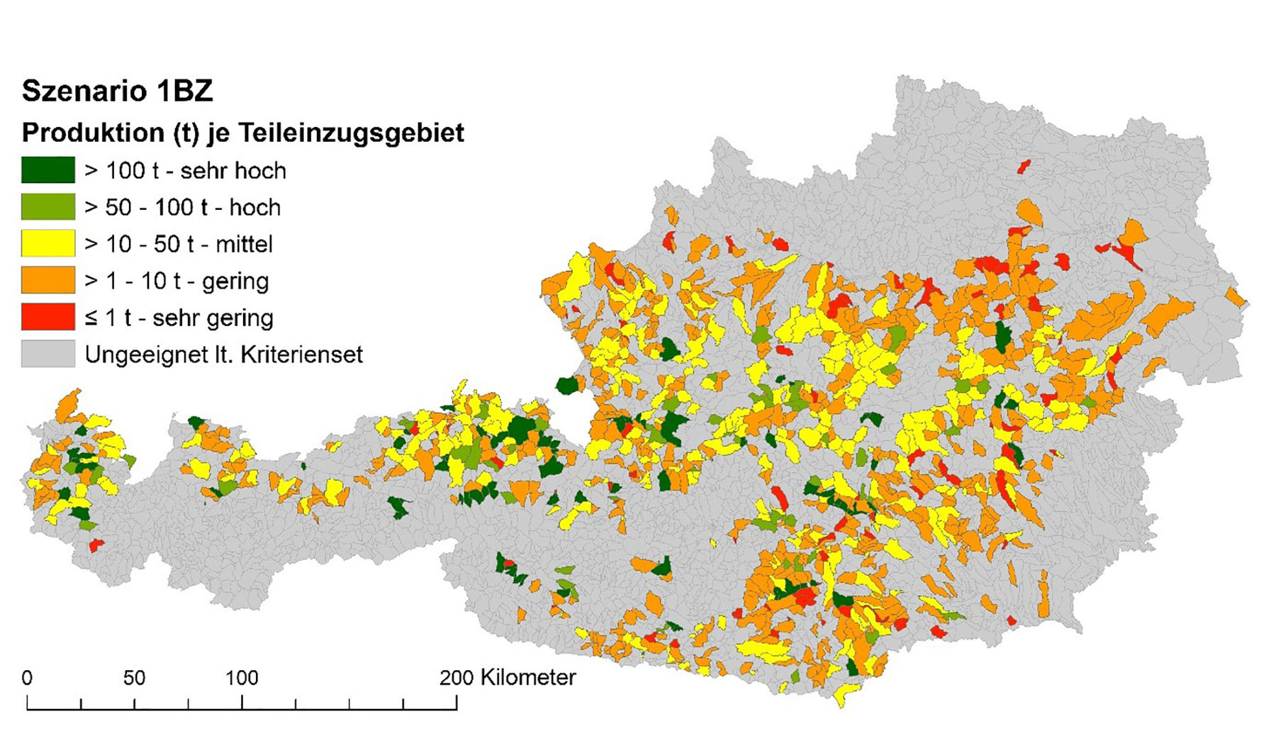 Die Ergebnisse der verschiedenen Szenarien zeigen enorme Möglichkeiten am Forellensektor auf. Eine extensive Produktion (180 kg/Sekundenliter) bei sehr gut geeigneten Arealen ergäbe eine Gesamtproduktion von knapp 40.000 Tonnen jährlich! Derzeit werden rund 2.900 Tonnen an Forellen produziert - also lediglich 7% von dem was möglich wäre. Regionen mit hohem Potential werden in der Grafik für Teileinzugsgebiete der Flusssysteme (durchschnittliche Größe von 17 km²) dargestellt. Aus der Studie soll nun ein Beratungstool entstehen, das Fischzüchter künftig bei der Standortsuche unterstützt.