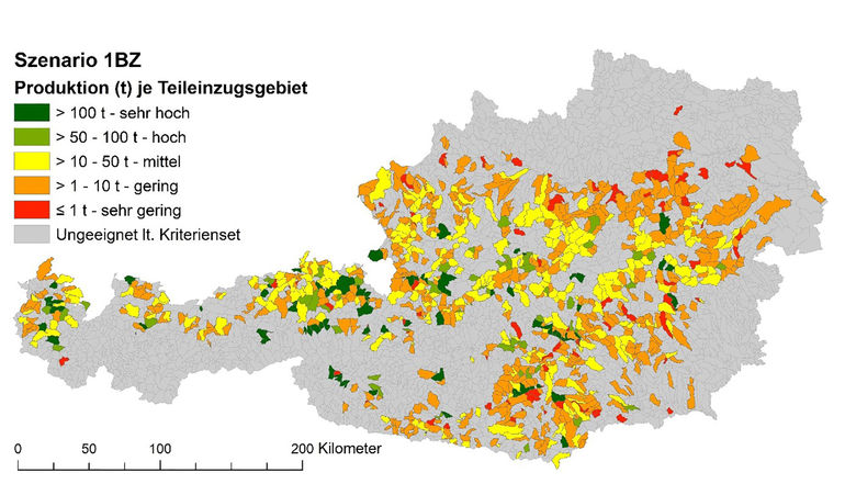 Um eine nachhaltige Entwicklung der Aquakultur zu fördern, bedarf es strategischer Überlegungen, wie zum Bespiel das Wissen, wo Regionen sind, die sich besonders gut für die Forellenproduktion eignen. Das wurde bei einer BOKU-Studie erstmals mit einer GIS-Analyse, also einer Verschneidung von räumlichen Geo-Daten entlang österreichischer Bäche und Flüsse untersucht. Insgesamt wurden mehr als 30 Kriterien miteinander kombiniert, um die Eignung für die Fischzucht zu beurteilen. Berücksichtigt wurden Wasserverfügbarkeit, Wasserqualität, Landressourcen, mögliche Konflikte mit anderen Nutzungen (wie beispielsweise der Wasserkraft), Wasserschutzgebiete und Hochwasserabflussbereiche. Für geeignete Gebiete wurde dann die mögliche Forellenproduktionsmenge unter Berücksichtigung der Umweltstandards (d.h. Restwasservorgaben, Emissions- und Immissionsgrenzen) berechnet.